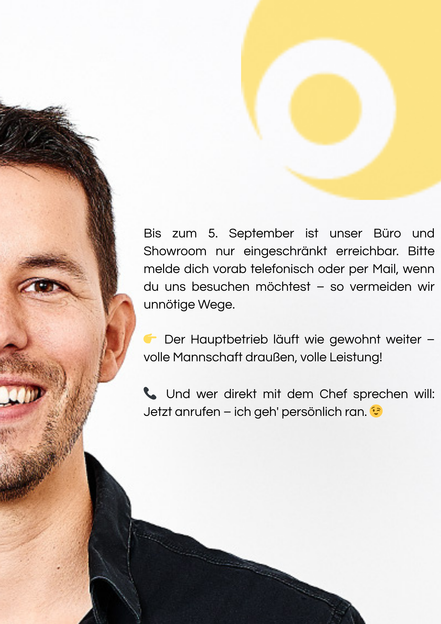 Bis zum 5. September ist unser Büro und Showroom nur eingeschränkt erreichbar. Bitte melde dich vorab telefonisch oder per Mail, wenn du uns besuchen möchtest – so vermeiden wir unnötige Wege. Der Hauptbetrieb läuft wie gewohnt weiter – volle Mannschaft draußen, volle Leistung! Und wer direkt mit dem Chef sprechen will: Jetzt anrufen – ich geh' persönlich ran. 😉
