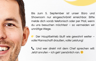 Bis zum 5. September ist unser Büro und Showroom nur eingeschränkt erreichbar. Bitte melde dich vorab telefonisch oder per Mail, wenn du uns besuchen möchtest – so vermeiden wir unnötige Wege. Der Hauptbetrieb läuft wie gewohnt weiter – volle Mannschaft draußen, volle Leistung! Und wer direkt mit dem Chef sprechen will: Jetzt anrufen – ich geh' persönlich ran. 😉